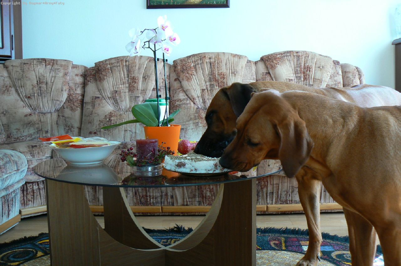 Název snímku:Panička dovolila, že můžem ochutnat dortík přímo ze stolu (zase prý bude pak zákaz - no jasně). /