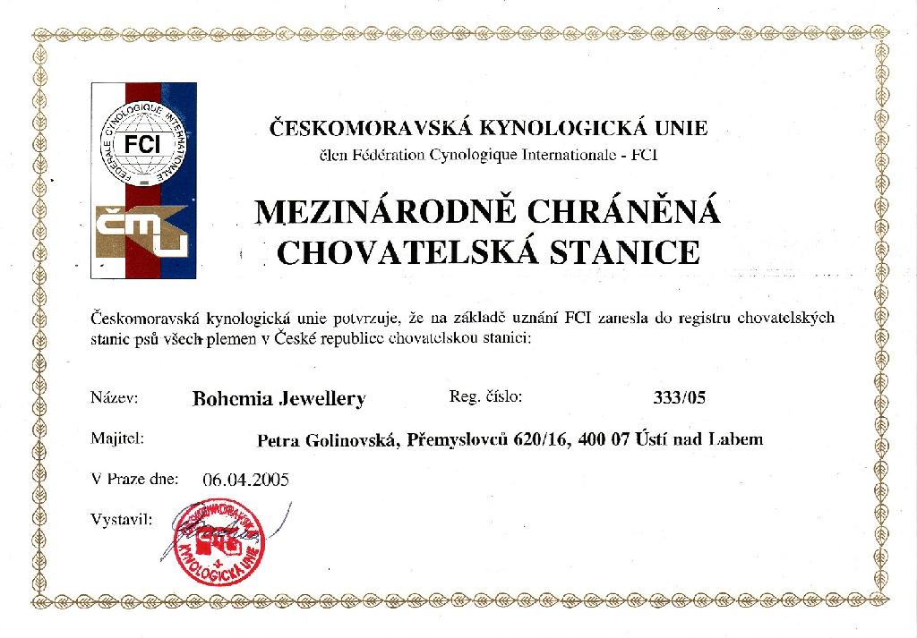 Adresa: Přemyslovců 620/16,400 07 Ústí nad Labem Telefon: +420606 476 442, 739 923 146 Zodpovědná osoba: Petra Golinovská www: bohemia-jewellery.ic.cz Mail: | Reg. číslo CHS: 333/05 Certifikát CHS: Zobrazit Certifikát ::: Plánujeme vrh: 21.05.2014 Hodnocení: 96 bodů ze 100 |