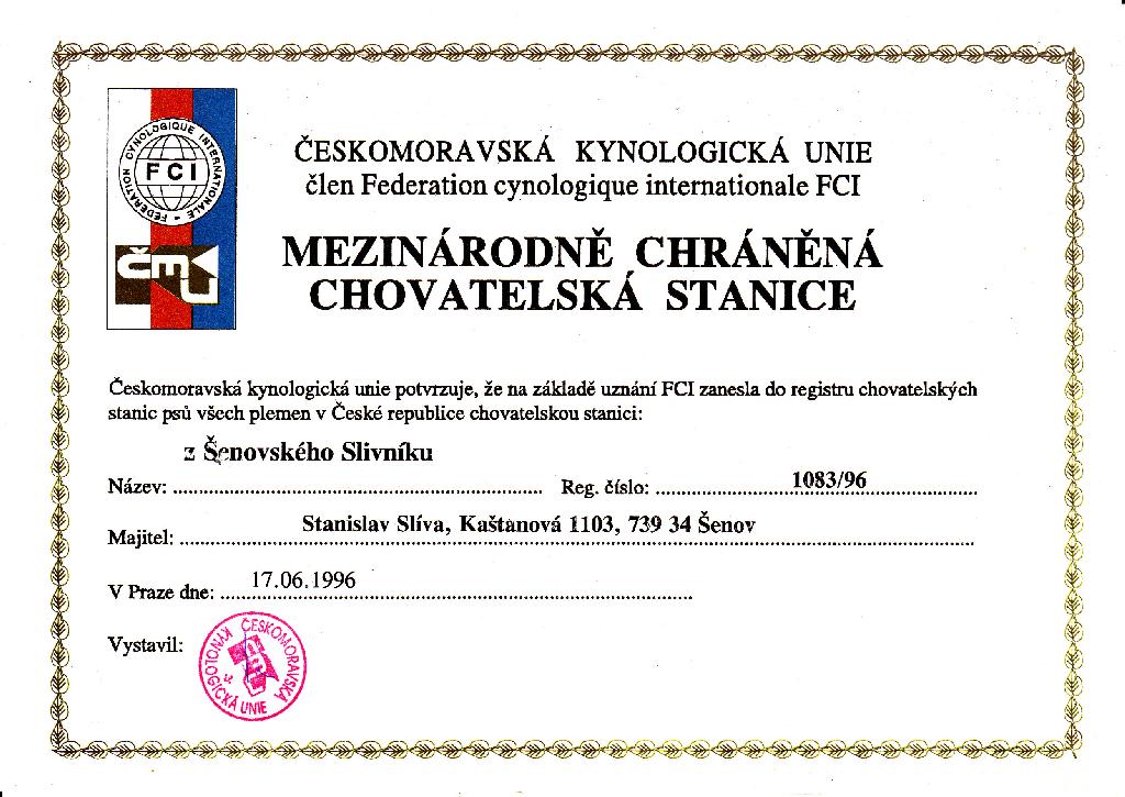 Adresa: Šenov u Ostravy Telefon: +420605543881 Zodpovědná osoba: Slíva Stanislav www: zsenovskehoslivniku.cz Mail: | Reg. číslo CHS: 1083/96 Certifikát CHS: Zobrazit Certifikát ::: Plánujeme vrh: 02.12.2010 Hodnocení: 94 bodů ze 100 |