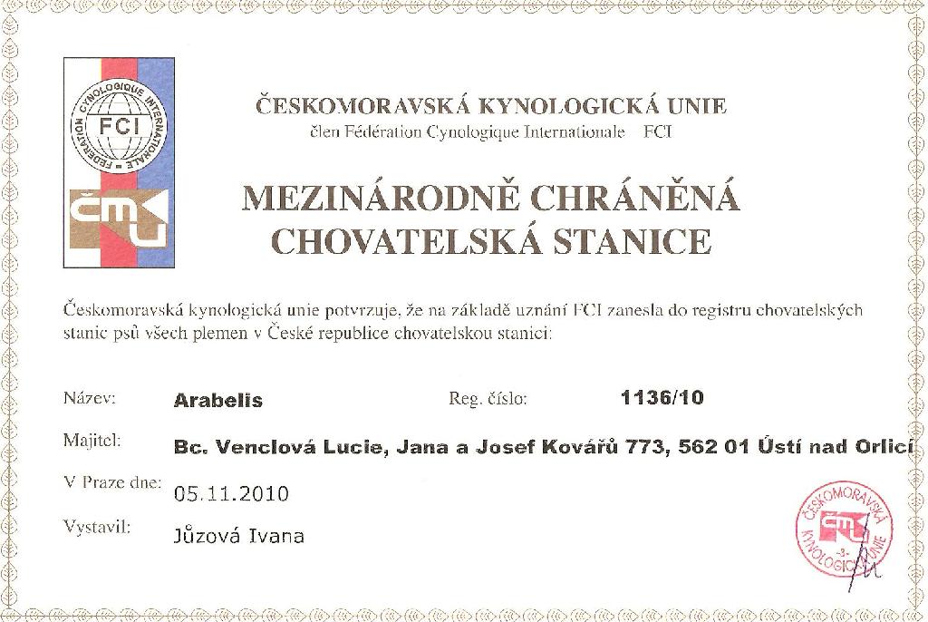 Adresa: Ústí nad Orlicí Telefon: +420777225840 Zodpovědná osoba: Bc. Lucie Venclová www: www.arabelis.cz Mail: | Reg. číslo CHS: 1136/10 Certifikát CHS: Zobrazit Certifikát ::: Plánujeme vrh: 01.03.2011 Hodnocení: 92 bodů ze 100 |
