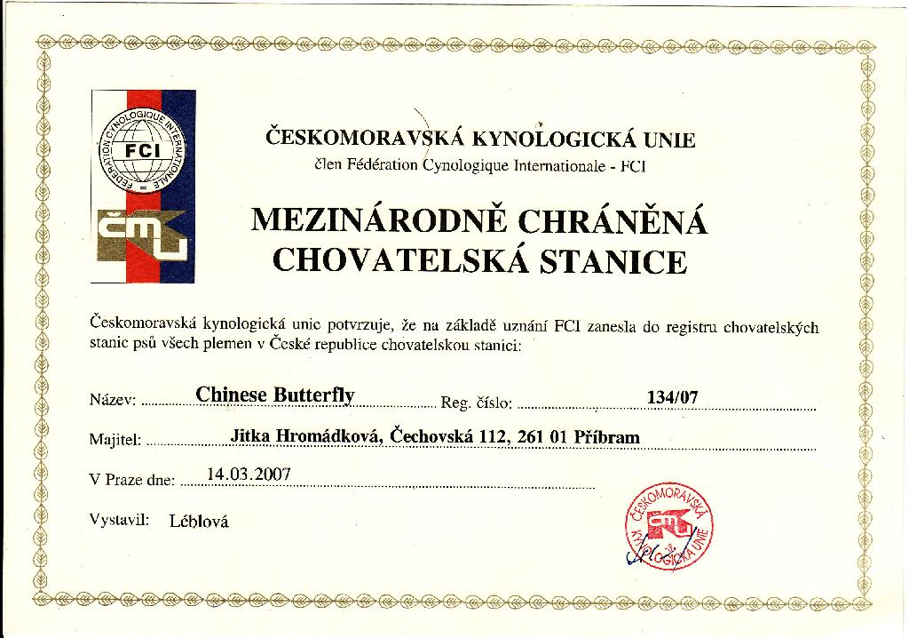 O nás:Chinese Butterfly je malá chovatelská stanice založená v roce 2007. Pocházíme z malého města Příbram, které se nachází v samém srdci České republiky. Od roku 2011 pobýváme většinu roku v krásné zemi plné květin Holandsku v městě Rotterdam. Vášeň pro plemeno čínského chocholatého psa se stala naším způsobem života. Naši psi jsou zapojeni do všeho co děláme a dbáme na to, že jejich fyzické a emocionální potřeby jsou splněny. Proto je náš chov dobře naplánován. Naši psi jsou pravidelně testovány a ošetřováni námi pečlivě vybraným veterinářem. Po většinu roku nás můžete potkat na mezinárodních či národních výstavách po celé střední Evropě, v menším počtu i na českých výstavách. Jsme zastánci raději méně vrhu s kvalitními štěňátky než bezhlavého množení. Jedním z našich cílů je pečlivé vybírání vhodného majitele pro naše narozená štěňátka, aby byla chována s láskou a porozuměním.