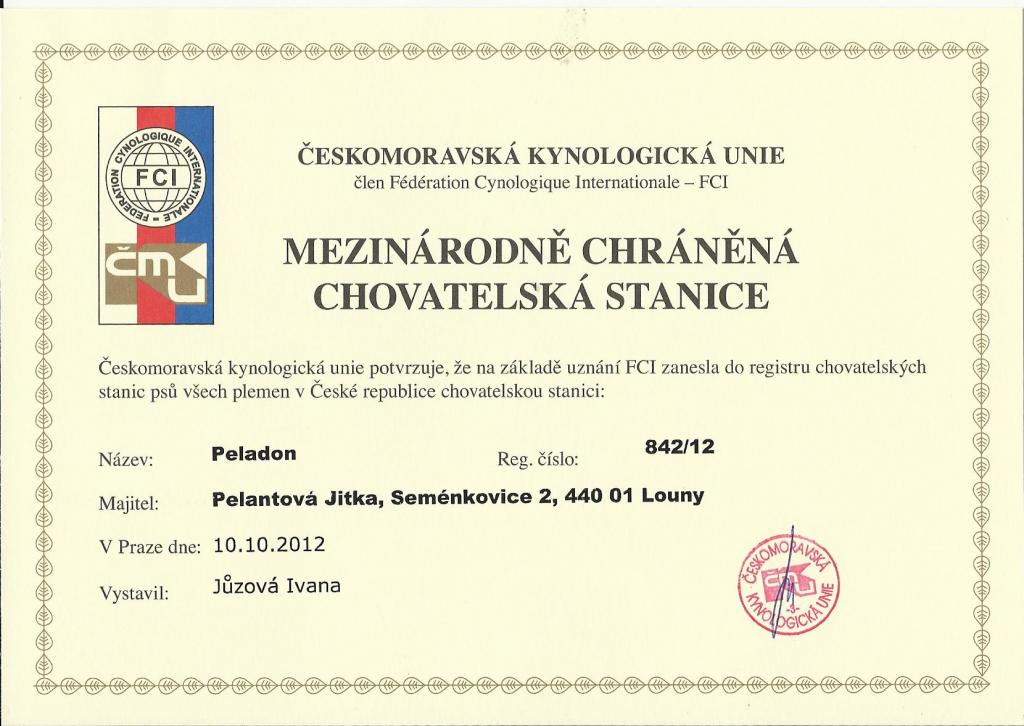 Adresa: Seménkovice 2, Louny Telefon: +420605171731 Zodpovědná osoba: JITKA93 www: peladon.webnode.cz/ Mail: | Reg. číslo CHS: 842/12 Certifikát CHS: Zobrazit Certifikát ::: Plánujeme vrh: 28.09.2013 Hodnocení: 76 bodů ze 100 |