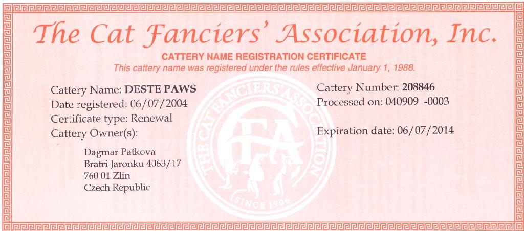 Adresa: Zlín, Česká republika Telefon: +420 577 221 295 Zodpovědná osoba: Dagmar Pátková www: www.cattery.cz/destepaws/ Mail: | Reg. číslo CHS: 208846 Certifikát CHS: Zobrazit Certifikát ::: Hodnocení: 90 bodů ze 100 |