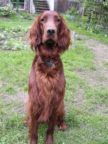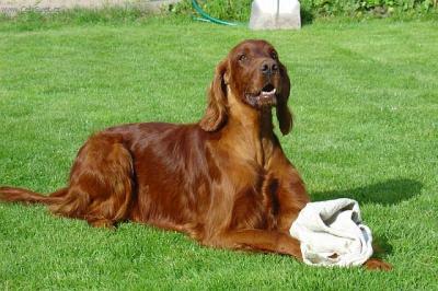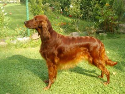 Irský setr - vznikl po specializaci barev setrů kolem poloviny předminulého století z bíločervených setrů, chovaných převážně v Irsku.Výběrem převážně červených psů byl vyšlechtěn celočervený irský setr, jak ho známe dnes. Je to elegantní, ušlechtile stavěný pes s vysoce vyvinutými loveckými vlohami. Neobyčejně silně vyvinutý lovecký pud bývá příčinou těžší ovladatelnosti, ale důsledným výcvikem se z irského setra stane skutečně jedinečně upotřebitelný lovecký pes s vlohami pro všestranou práci, zejména s vrozenou ochotou pro vodní práci a přinášení. Od doby, kdy byl irský setr představen na výstavách psů, získal si stále rostoucí oblibu i u těch milovníků psů, kteří se nijak nezabývají lovem či myslivostí. Nápadná sytá mahagonově červená barva dlouhé splývavé srsti s nafialovělým kovovým leskem, vznosná postava a aristokratická ušlechtilost celkového zjevu činí z irského setra pravého elegána mezi všemi plemeny psů vůbec. Důležitou roli hraje také jeho milá, oddaná a něžná povaha. Lidé jsou přímo fascinováni oduševnělostí pohledu tohoto červeného Ira. Pravdou je , že při pohledu do zářících očí setra se do něj musíme jednoduše zamilovatt. Irský setr potřebuje však jako svého pána rozumnou osobu, která bude mít dostatek času,aby dokázala vyhovět jeho potřebám. Má-li se psovi tohoto plemene opravdu dařit dobře, musí si být jist, že je milován a že ho jeho lidé potřebují.