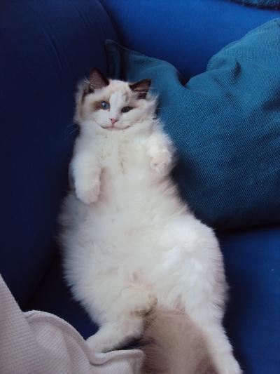 O plemeni:Ragdoll je velká a těžká kočka,proslulá zejména svou klidnou povahou.Má polodlouhou srst jemné struktury.Barvy a odznaky se vyvíjejí pomalu často 2-4 roky.Jsou dobře osvalené a hmotností předstihují ostatní plemena koček,ale je to plemeno velmi dobromyslné.Snadno se vycvičí pomocí odměny,může i aportovat.Nejkrásnější na ragdollovi jsou jeho překrásné modré oči.