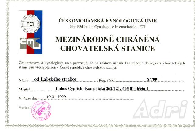 Adresa: Kamenická 262/121, Děčín Telefon: +420 603 963 510 Zodpovědná osoba: Renata Cyprichová www: www.odlabskehostrazce.cz Mail: | Reg. číslo CHS: 84/99 Certifikát CHS: Zobrazit Certifikát ::: Plánujeme vrh: 10.07.2010 Hodnocení: 92 bodů ze 100 |