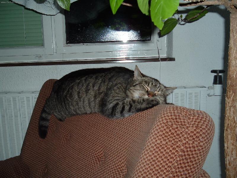 kočka natažená na opěradle křesla