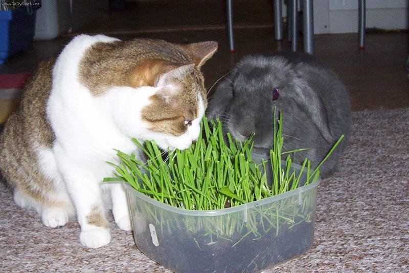 kočička právě nabádá králíka k ochutnání trávičky