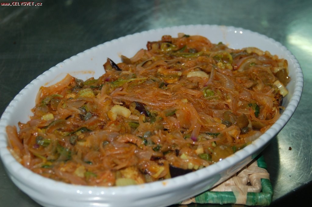 Postup přípravy: Krok 1: Lilek nakrájíme na centimetrové kostky, osolíme a necháme 30 minut stát. Poté opláchneme studenou vodou a osušíme. Krok 2: Na pánvi rozehřejeme část oleje a přidáme lilek, který opékáme asi 10 minut do změknutí, poté ho z pánve vyjmeme. Krok 3: Do oleje na pánvi přidáme nakrájený řapíkatý celer a opečeme ho asi 5 minut do zhnědnutí. Krok 4: Lilek vrátíme na pánev, přidáme cibuli, rajčatový protlak, cukr a ocet a vše dusíme asi 10 minut do změknutí.Můžeme podle potřeby podlít trochou vody. Krok 5: Pánev odstavíme,přidáme kapari a část nakrájené petrželky, olivy a česnek. Podle chuti dosolíme a opepříme a necháme uležet a vychladnout. Krok 6: Pokrm servírujeme na talířích sypaný sekanou petrželkou. |