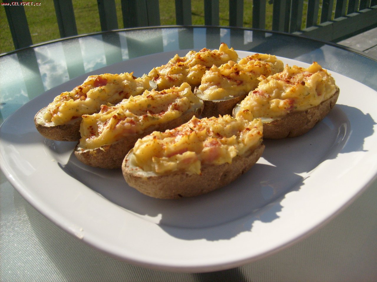 Postup přípravy: Krok 1: Brambory očistíme, propíchneme vidličkou, zabalíme do alobalu, vložíme na grilovací pekáč a pečeme na grilu doměkka. Krok 2: Pečené brambory rozpůlíme a středy lžičkou vydlabeme. Krok 3: Vydlabanou část promícháme s nakrájenou šunkou a vložíme zpět do vydlabané části. Krok 4: Půlky brambor naskládáme do tukem vymazané žáruvzdorné mísy a na každou položíme plátek camembertu. Krok 5: Plněné brambory přelijeme vínem a vložíme na 20 minut zapéct dozlatova do trouby. |